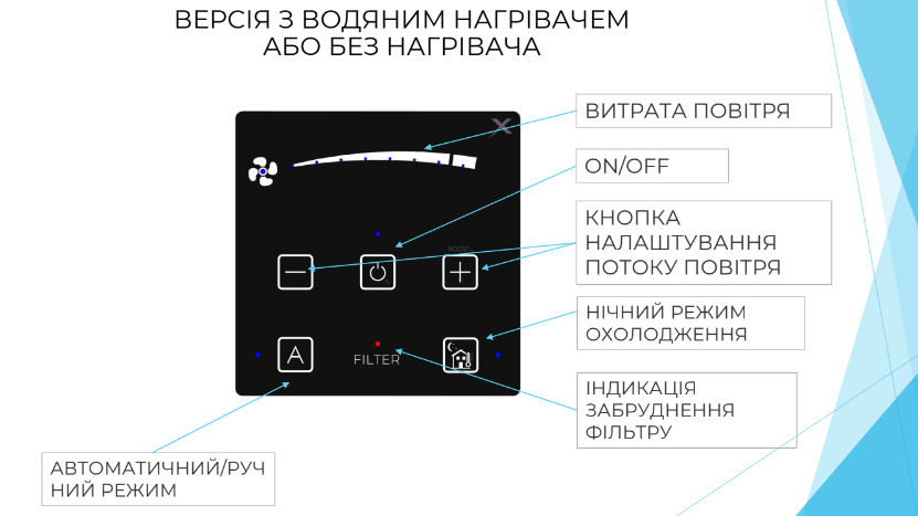 Панель керування дозволяє регулювати витрату повітря, охолоджувати повітря холодним нічним повітрям влітку та регулювати температуру блоку з електронагрівачем. Вона сигналізує про засмічення фільтра та необхідність його заміни. Також на панелі з'являються робочі стани блоку, включаючи несправності.